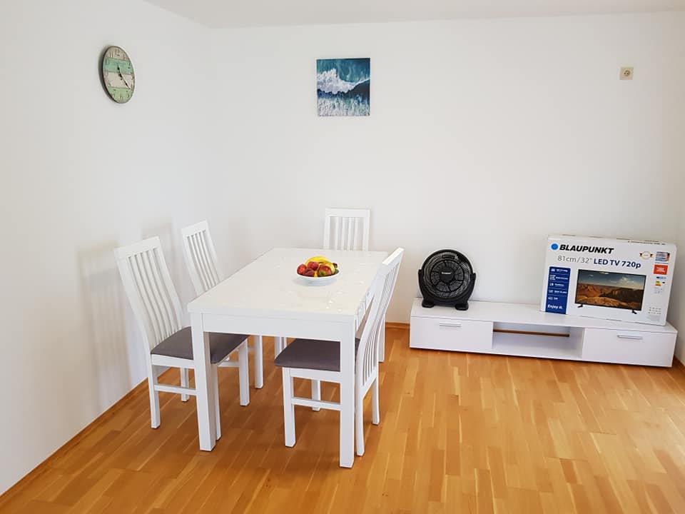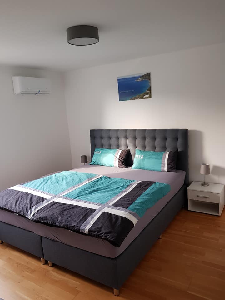 Apartman 2:EG (für 2-4 Personen)Bad, Schlafzimmer mit komfortablen Boxspringbett 180 x 200 cm und kleinem Balkon mit Loungemöbel, geräumige Küche mit Essbereich, kleines Wohnzimmer mit ausziehbarer Schlafcouch.